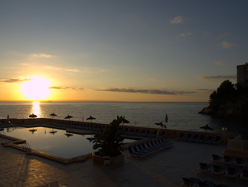 Right... This is not about the sunset, as the sun is too far to the left. Nor about the stunning sky, cause we see too much of the swimming pool. And the pool itself is not pretty enough (or lit enough for that matter) to make it an excuse for this shot.